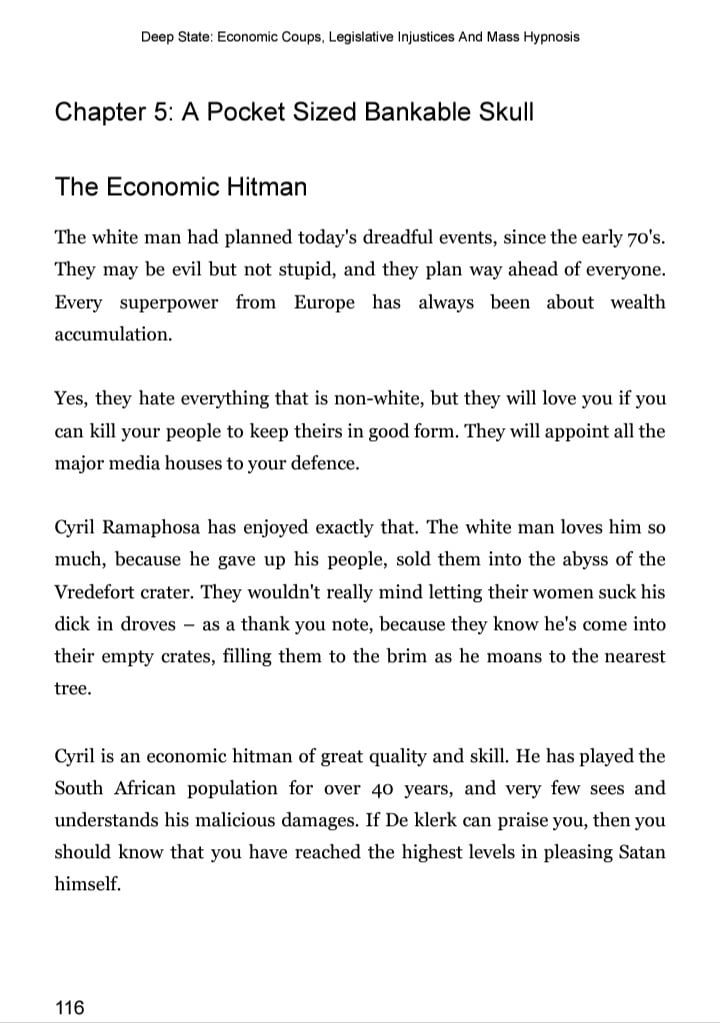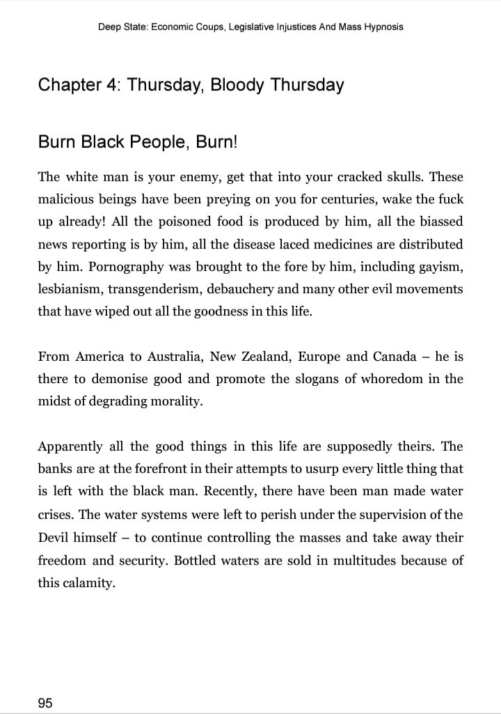 It is my responsibility, as a member of the human family, to warn you about the imminent dangers that are approaching. South Africa is a rotten bacon sandwich that is feasted on by human Devils in the most exclusive suburbs and black bastards in a Cabin called Parliament. As victims of political cleansing, you are seated under their colossal tables to gather filthy crumbs from their feasts.